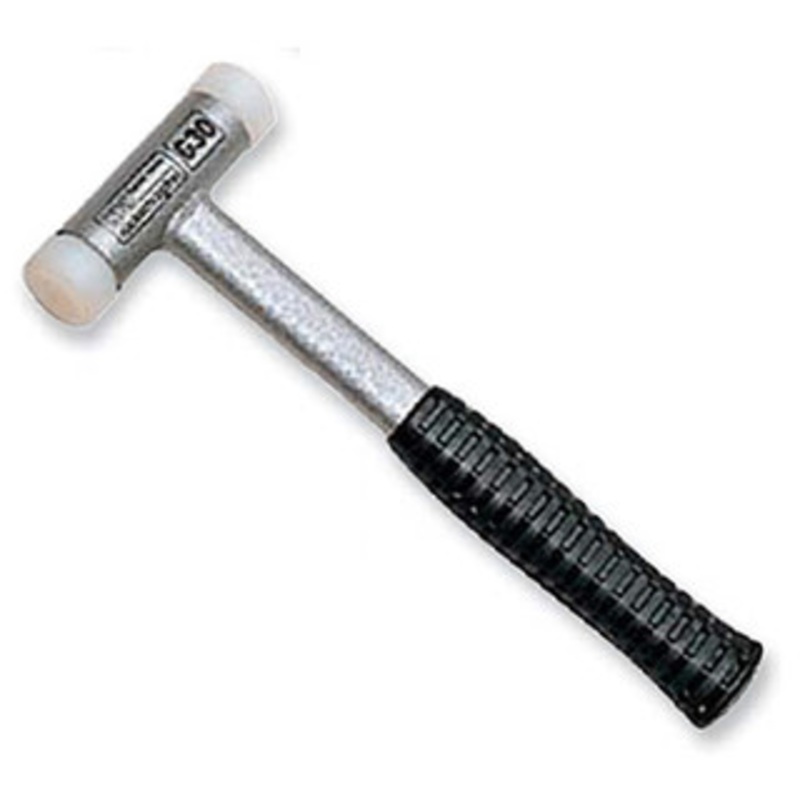Dead Blow Nylon Hammer, Heavy Duty Rubber Grip1-3/4" Face Dia., 12" Length Features: These Dead Blow Nylon Hammers feature a hollow hammer head filled with thousands of tiny steel balls The inertia of the individual pieces provides a bounce-free, 100% impa